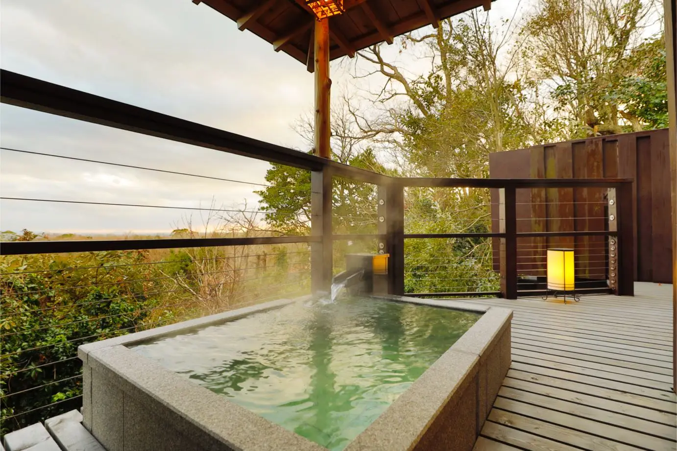 愛犬と癒される絶景の湯宿が伊豆高原に誕生。 全ての客室に備え付けられた露天温泉からは相模湾と伊豆諸島の絶景をお愉しみいただけます。