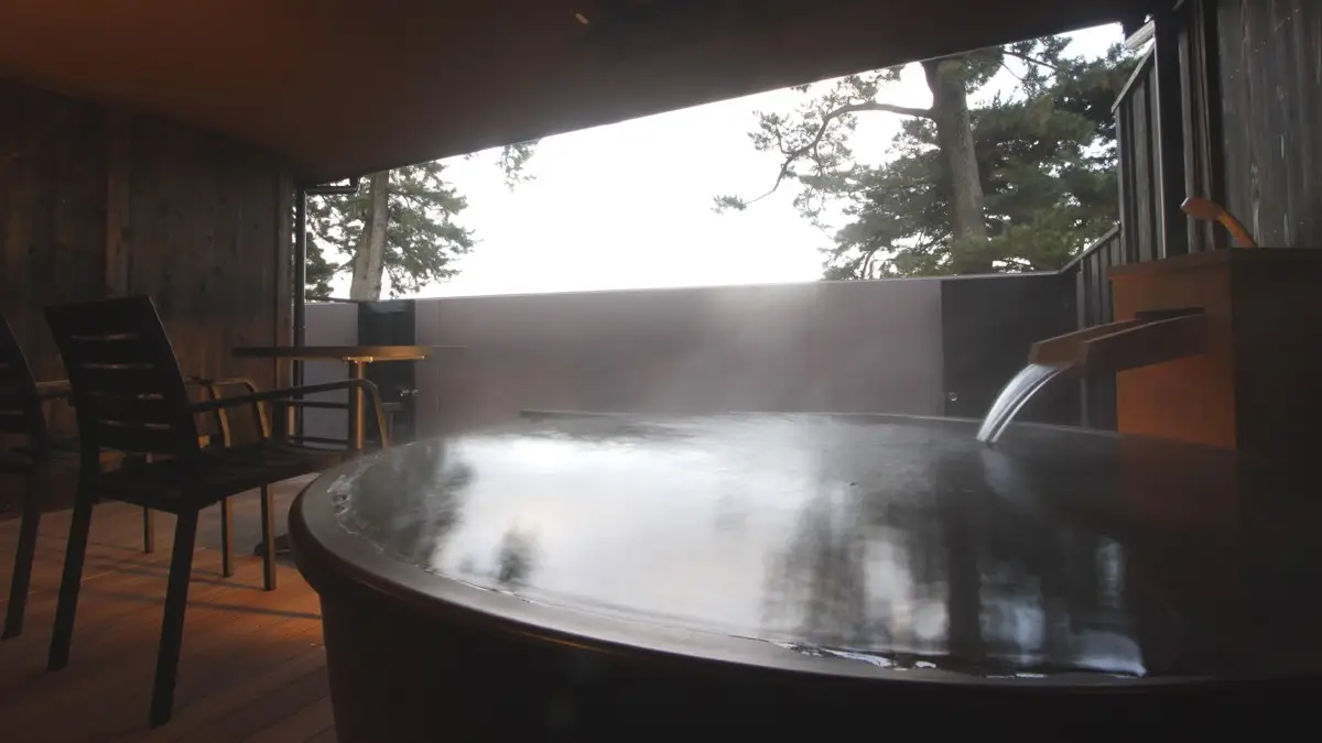 新館1階にペット同伴可能な客室が3室ある「味と湯の宿 ニューとみよし」。 バルコニーには信楽焼の露天風呂が2つあり、ひとつはワンちゃん専用の露天風呂で、客室専用お庭とお散歩用通路があります。 小型犬2頭まで宿泊可能です。目の前に広がる長浜海岸の心地良い空気をお楽しみください。