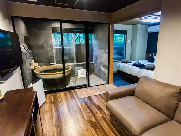 ペットと泊まれるリブマックスリゾート箱根芦ノ湖。お部屋には、檜を使用した半露天風呂ご用意しております。 愛犬と一緒にお部屋でお寛ぎ頂きながら、檜風呂で心と体を癒してください。カラオケ・卓球ルームなど充...
