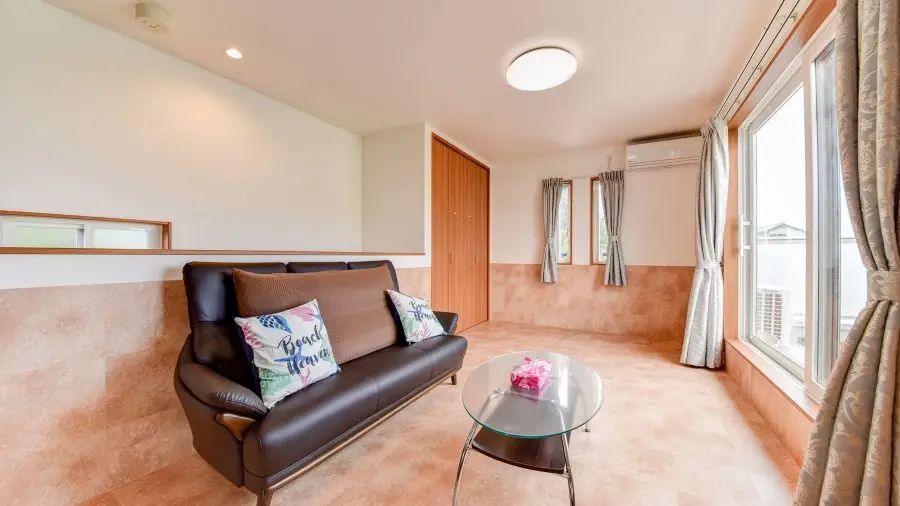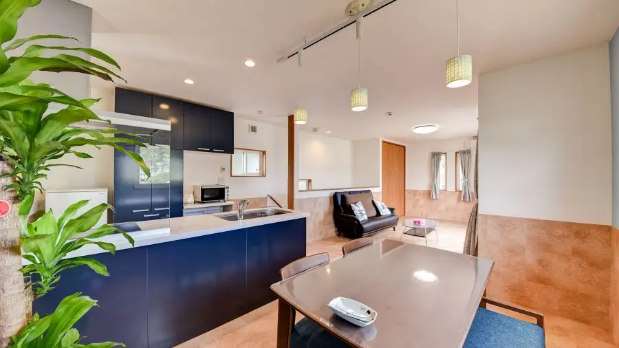 オーシャンビューを目前にした二階建ての一棟貸切コテージ。お部屋は冷暖房・床暖房完備。お食事は自炊やお庭でBBQなどご家族に合わせてお過ごしください。一棟貸切なので他のワンちゃんを気にする事なく過ごせます。ドッグアメニティが充実していて、ドッグランや温水の足洗い場もあります。中型犬まで宿泊可能。