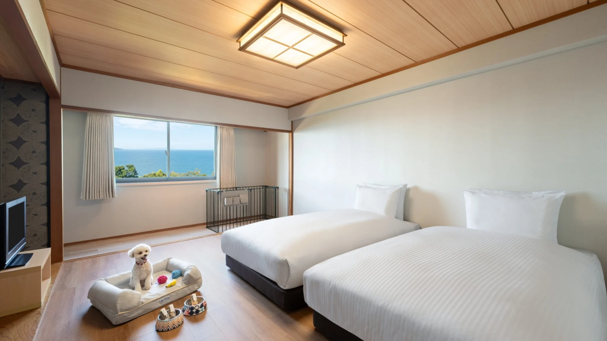 (1)大型犬は、スイートルームのみ受け入れ可能。1部屋につき、2頭まで。ご予約はわんちゃんと泊まれる部屋タイプのみご宿泊可能。チェックイン時にご宿泊の同意書及びワクチン接種証明のご提示をお願いしております。