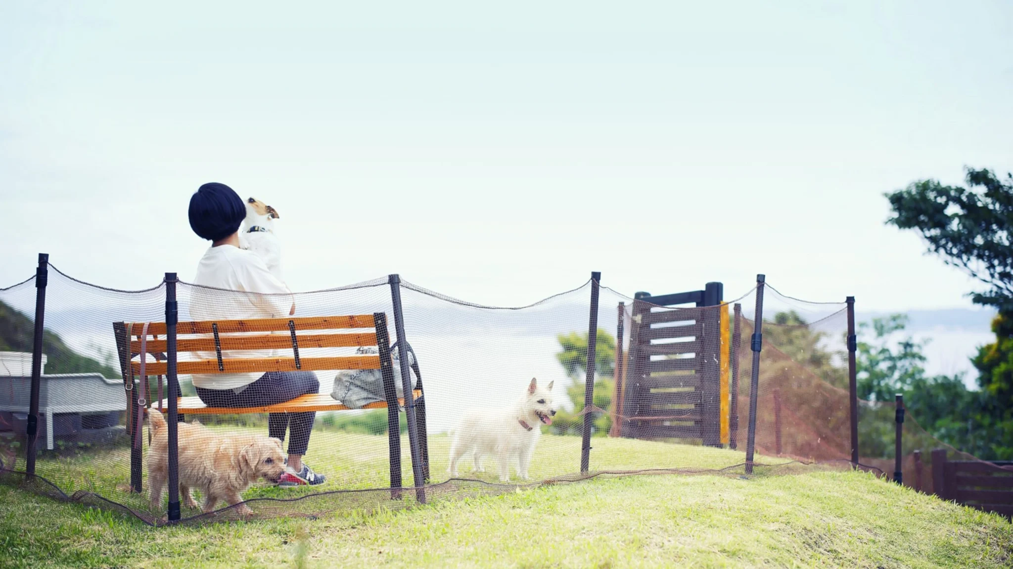 約300坪のドッグランでは、大型犬と小・中型犬でエリアを分けず、すべてのわんちゃんが同じ空間でのびのびと過ごせるスタイルを採用しています。犬種やサイズに関係なく、新しい友達を作れるフレンドリーな交流を楽しんでいただけます。 場内では、人間もわんちゃんも寝転がれる天然木材のプラットフォームが設置してあり、空を眺めながらリラックスできます。