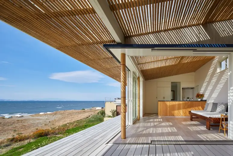 この竹影houseは建築家・中村拓志が南の島の小さなアウトドアリビングをテーマに設計。 爽やかな海風がリビングを心地よく通り抜け、美しく輝く海面と、抜けるような青空が東京湾である事を感じさせない。 竹の隙間から降り注ぐ太陽が、時間と共に変化し、美しい影を床に映し出します。 2016年に完成した竹影houseは、これまでオーナーが週末に利用していましたが、友人からの予約を希望する声があり、スミスのいえから2022年4月にオープンしました。