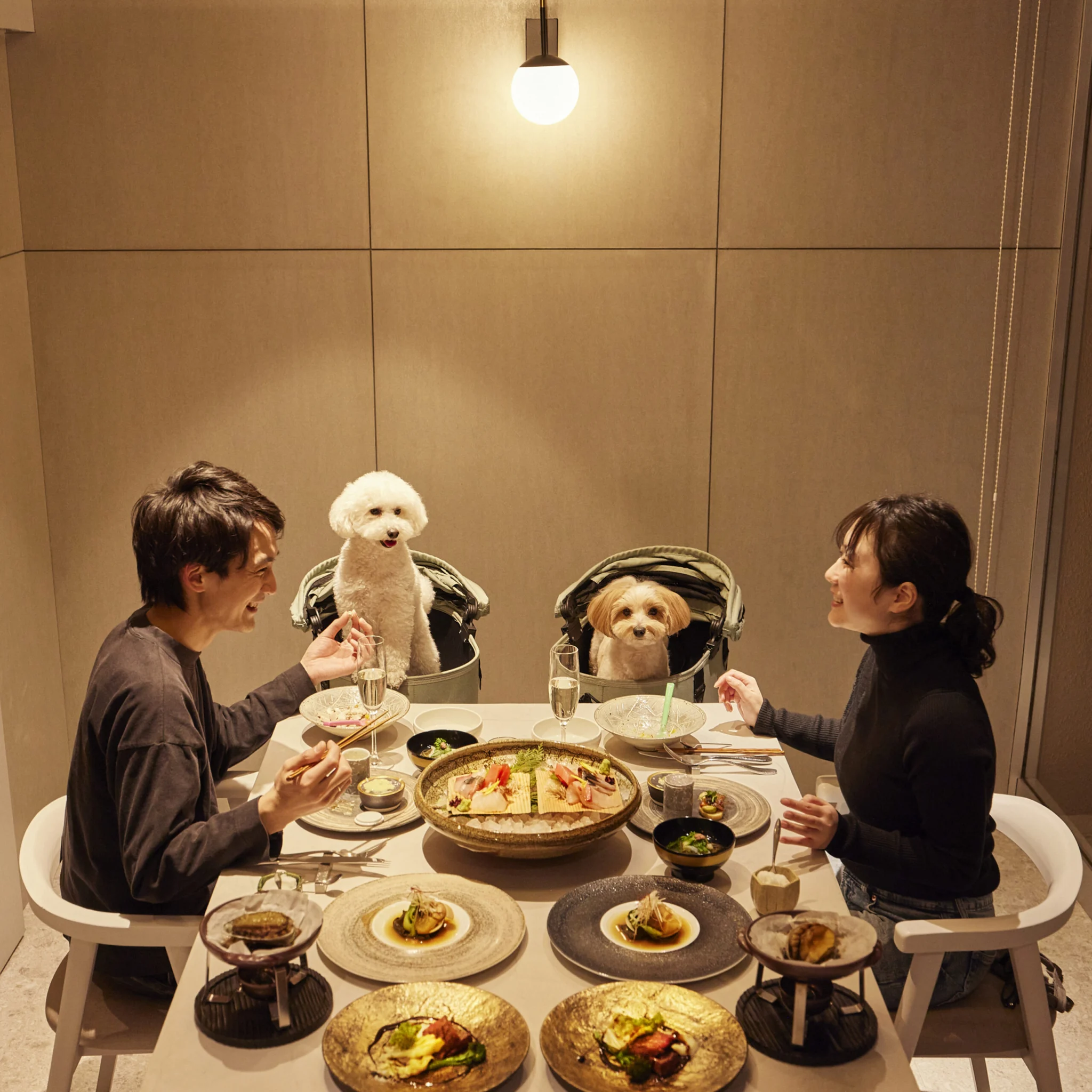 完全プライベートな個室ダイニングルームとしてお部屋をセパレートしています。他のお客様やわんちゃんのことを気にせず、ゆったりとしたお食事をお楽しみください。「DANQOO」オリジナルでご用意した愛犬用のダイニングチェアを使用することで、オーナー様と愛犬が同じ目線の高さでテーブルを囲み食事することが可能です。レストラン内にはお料理に合わせ、シャンパン、ワイン、日本酒、焼酎など、厳選した銘酒をセラーにご用意しております。
