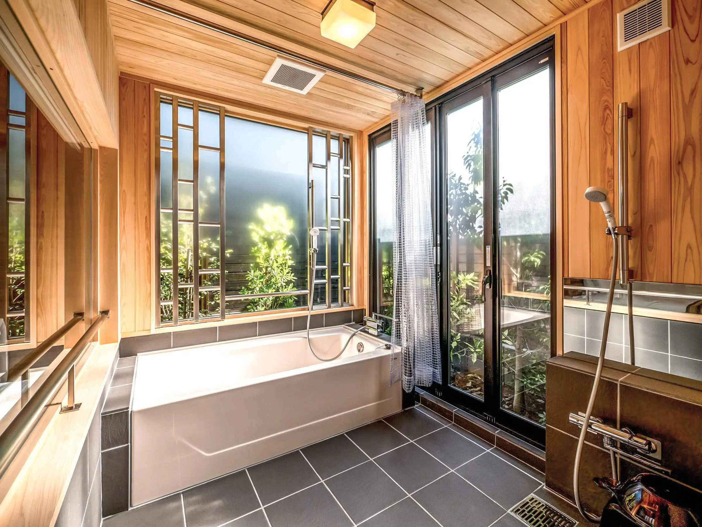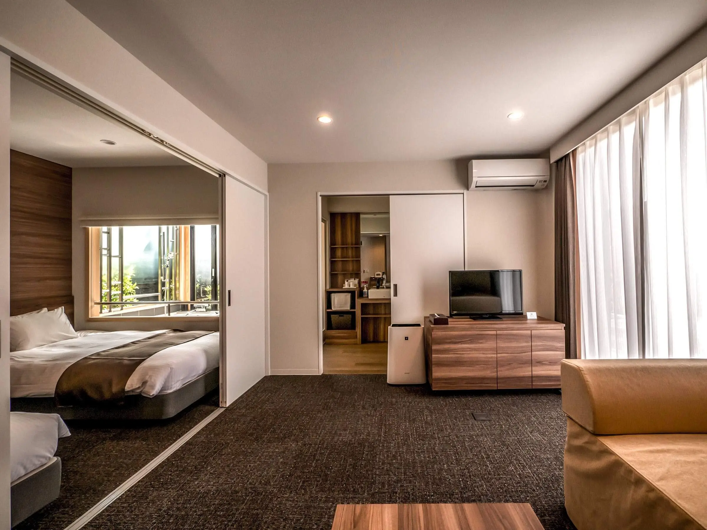コンテナ1台分のコンパクトなスタンダード ダブル・ツイン、2階建てにした、キッチン・ジャグジー付きのメゾネットスイート、コンテナ3台分を横に並べたグランスイートは、広々としたリビングを実現しました。