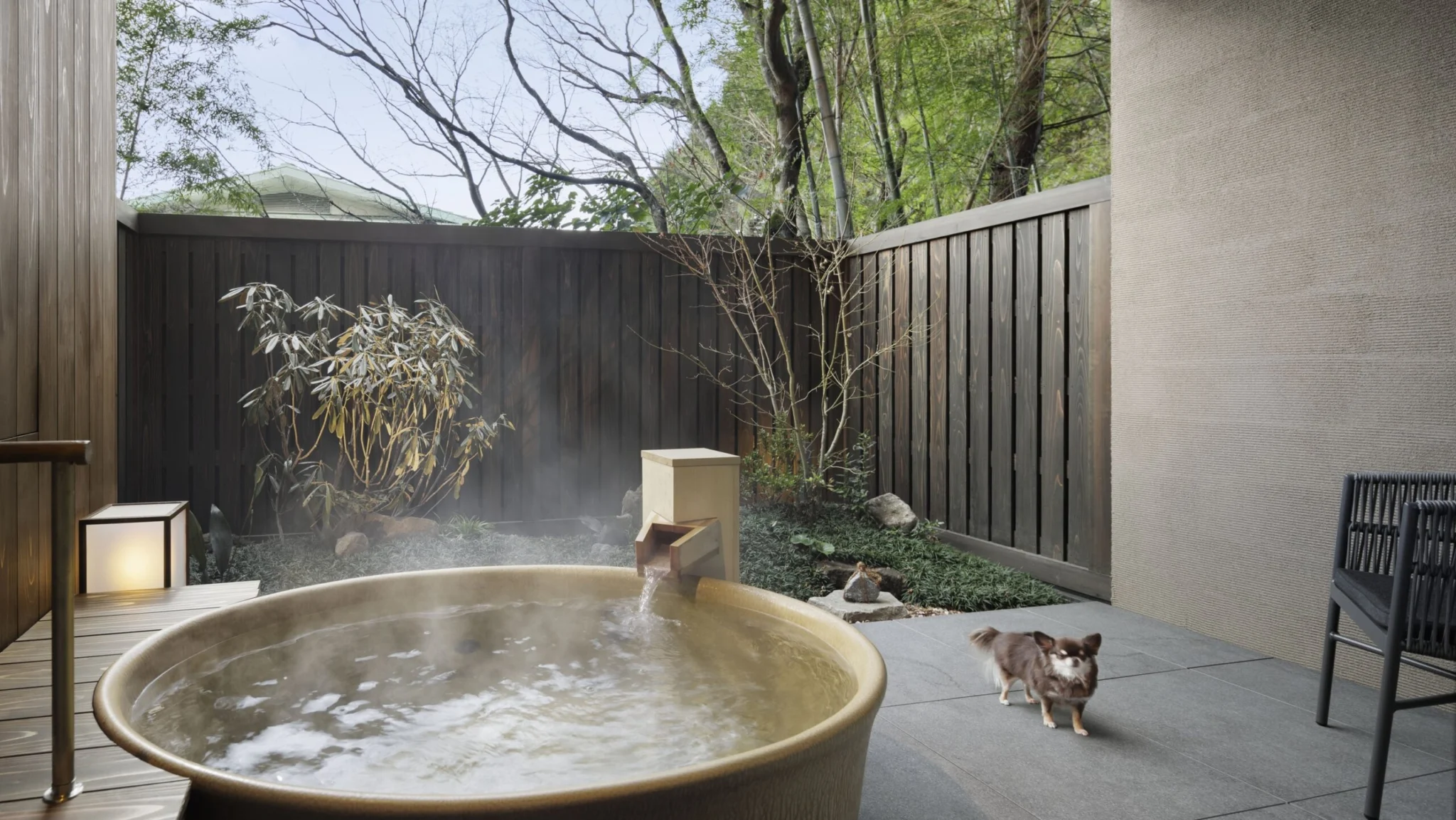愛犬と一緒に湯浴みが楽しめる箱根の隠れ家宿。お部屋の専用デッキには露天風呂と犬用のシャワーや洗い桶を備えています。愛犬と飼い主さんどちらも快適にお過ごしいただけるための設備とサービスを提供するお宿で、愛犬との旅を安心してお楽しみください。