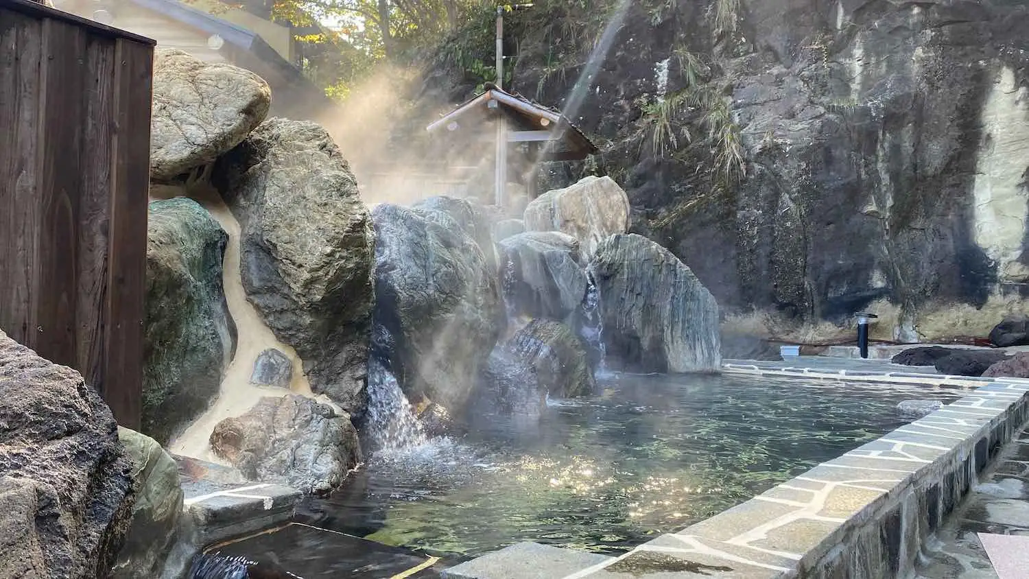 男女別にひのき風呂・ジェットバス・サウナ・露天風呂のほか、時間制の混浴露天風呂ゾーンには豪華な9mの打たせ湯。滝を眺めながらドリンクも楽しめる
