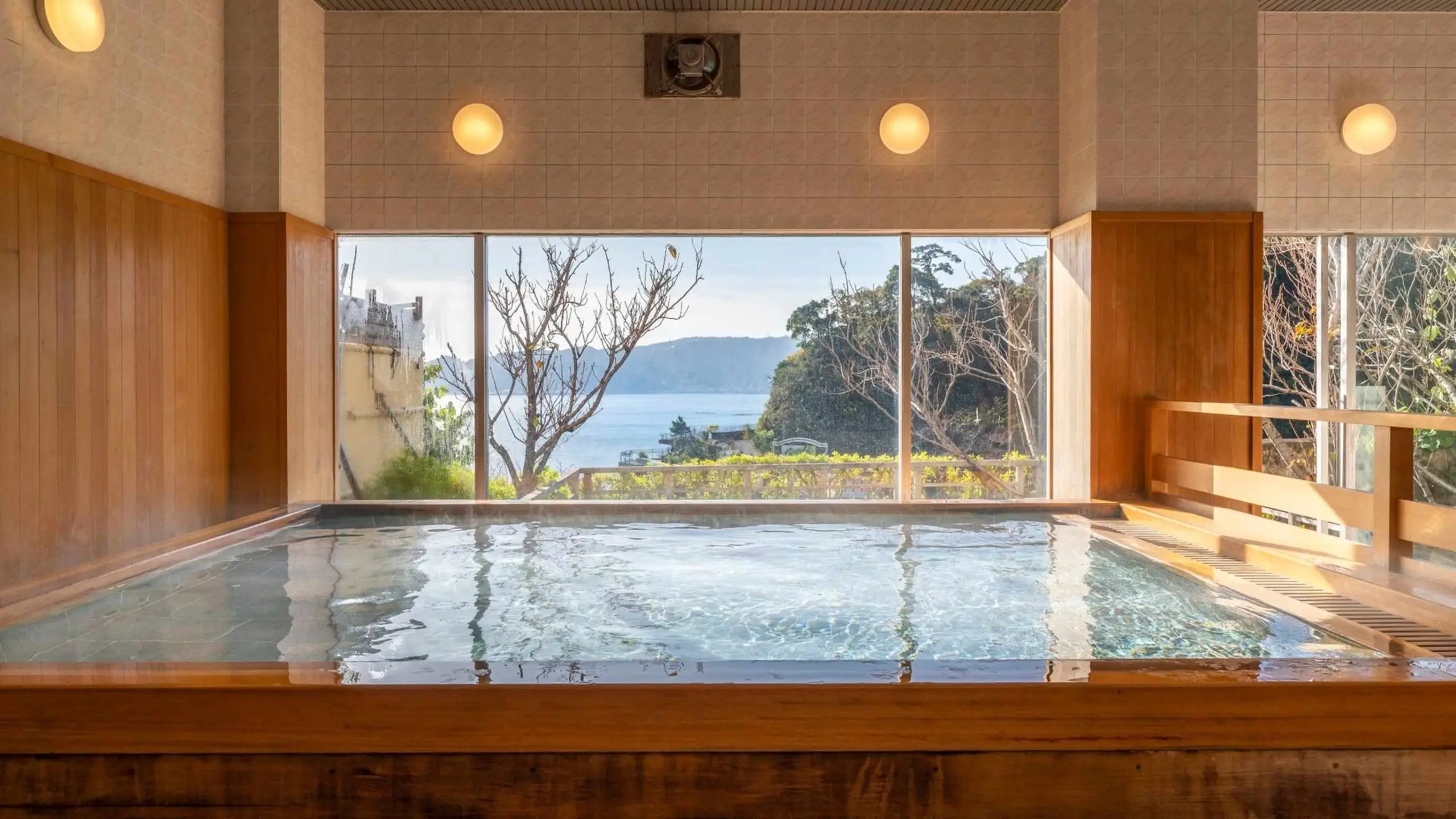 湯船の水面が海へつながるインフィニティデザインの露天風呂や檜が香る内風呂で癒しの時間をお過ごしください。