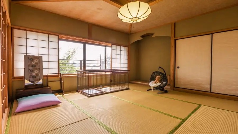 離れの客室は露天風呂付き。離れ以外の客室ではワンちゃんはケージに入れてください。