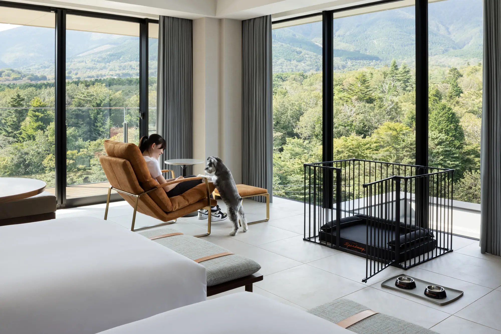 ホテルの離れに位置するガーデンヴィラや、ホテル棟のドッグフレンドリーツインルームでは、愛犬と一緒に宿泊が可能です。モータースポーツとホスピタリティが融合した、唯一無二の空間をお楽しみください。