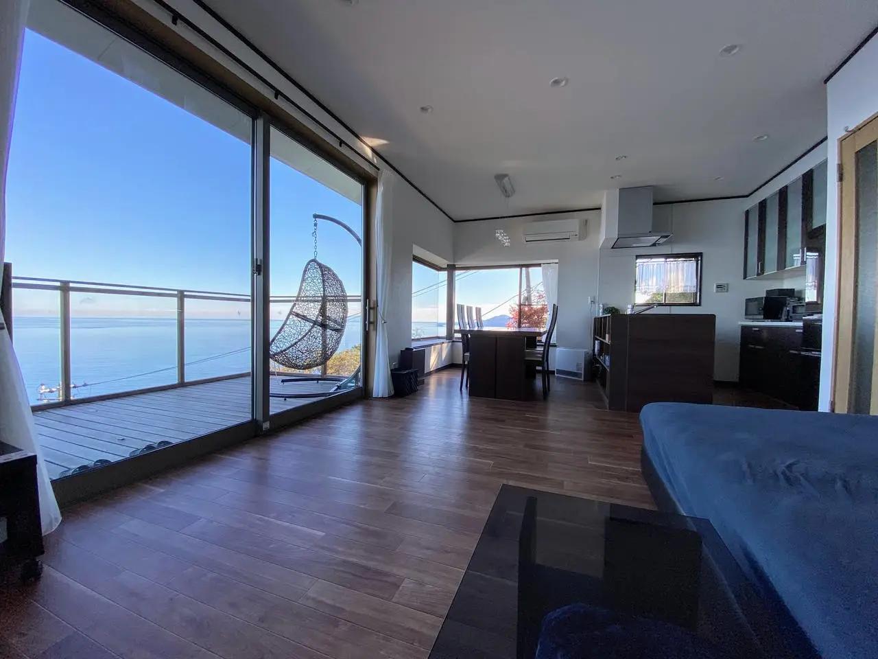 南熱海にある1棟貸し切りのプライベートハウス。全室からオーシャンフロントの絶景をお楽しみいただけます。温泉は源泉かけ流しの天然温泉で、湯船に浸かりながら海を眺めることができます。スカイテラスを新設し、2020年春にリニューアルオープンしました。中型犬2頭まで宿泊可能。