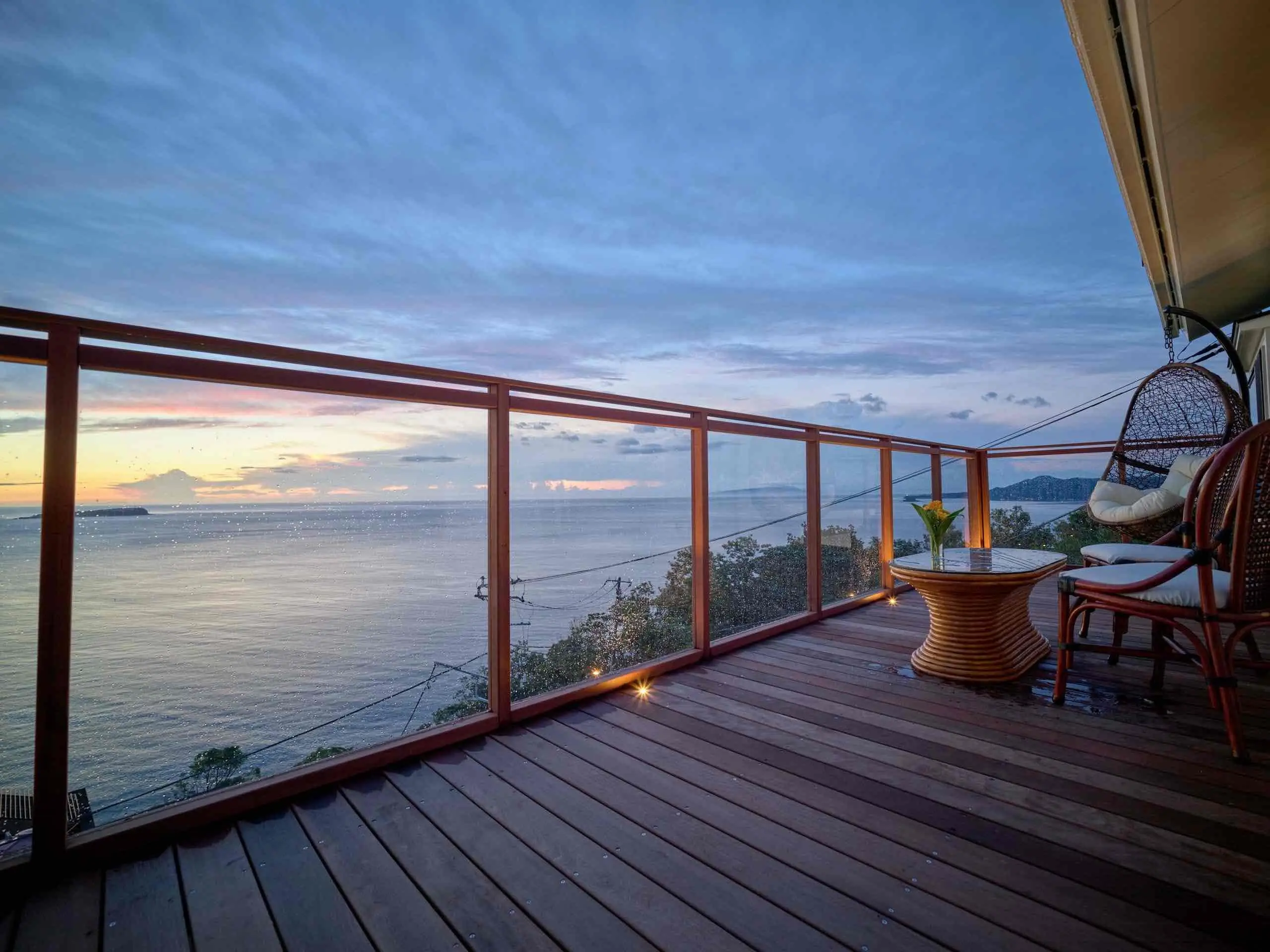 リビングから繋がるスカイデッキからのパノラマ海眺望。