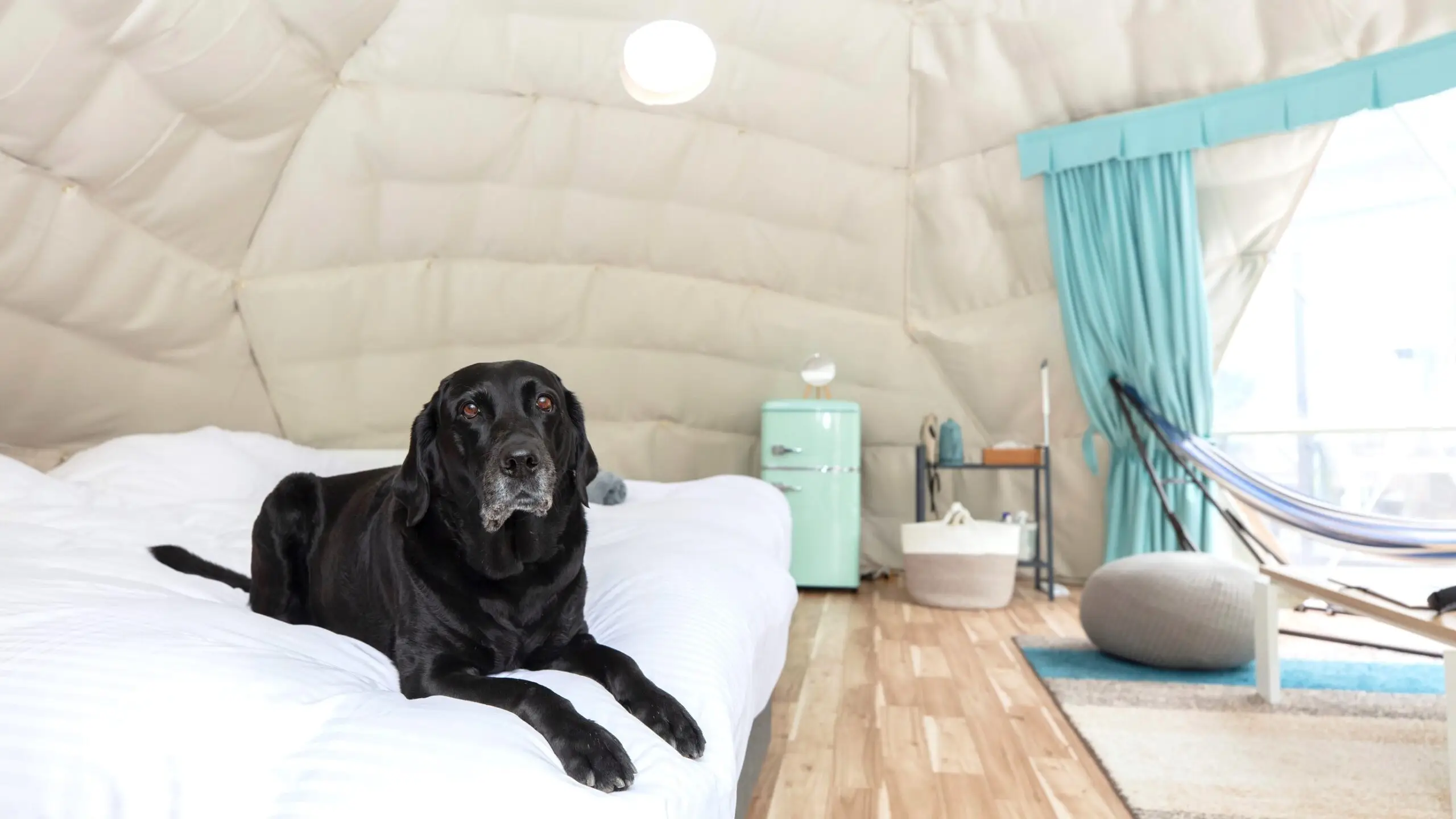 ペット同伴可能なドームテントは、直径6mで広々とした空間。