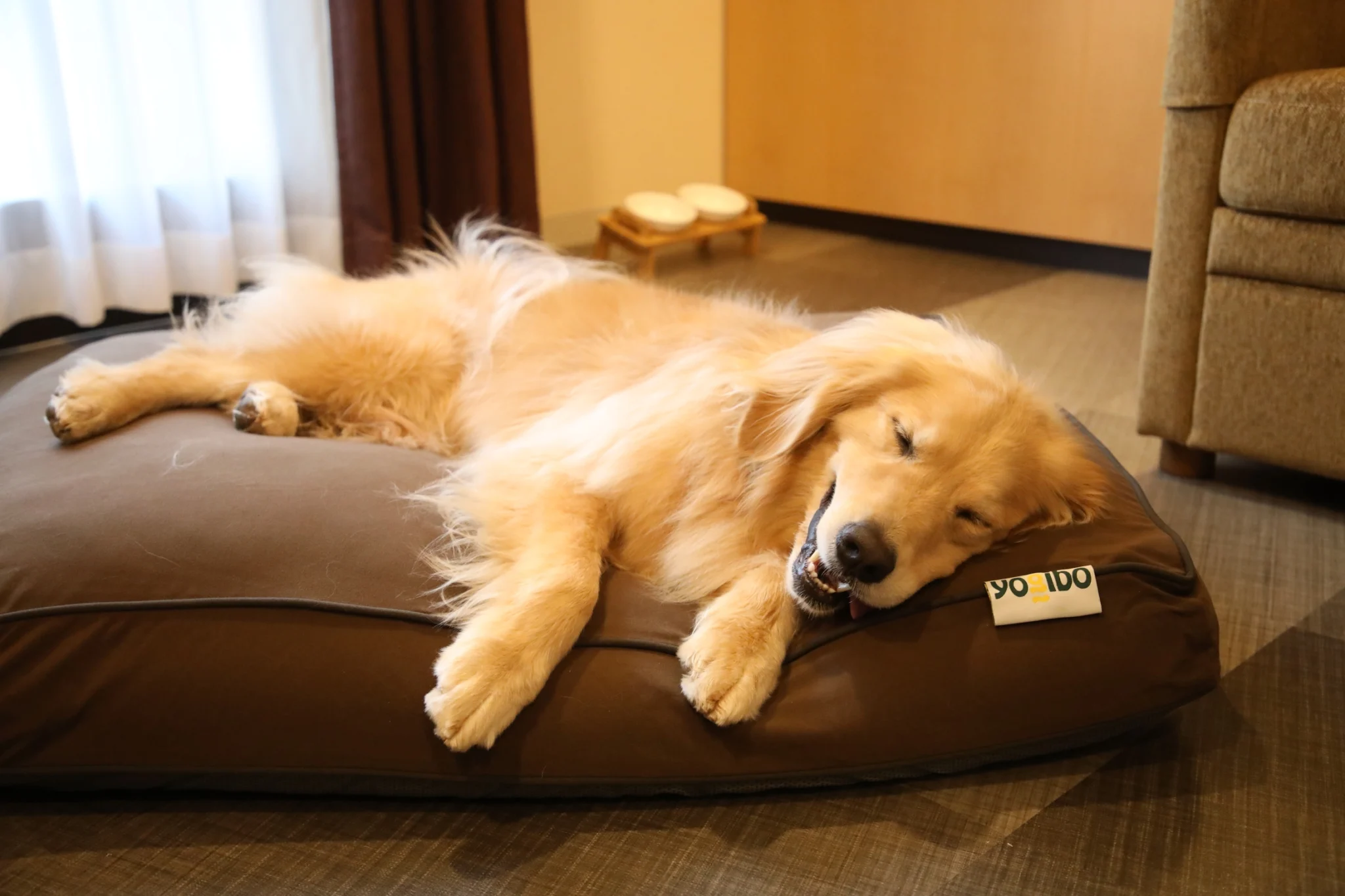 エントランスでも、廊下でも、そして客室のベッドでも。館内のどこでもワンちゃんと一緒に過ごせます。他にも、ワンちゃんのための施設や、ワンちゃんの目線の高さに配慮した低いインテリアを採用するなど、どこまでもドッグファーストなホテルです。