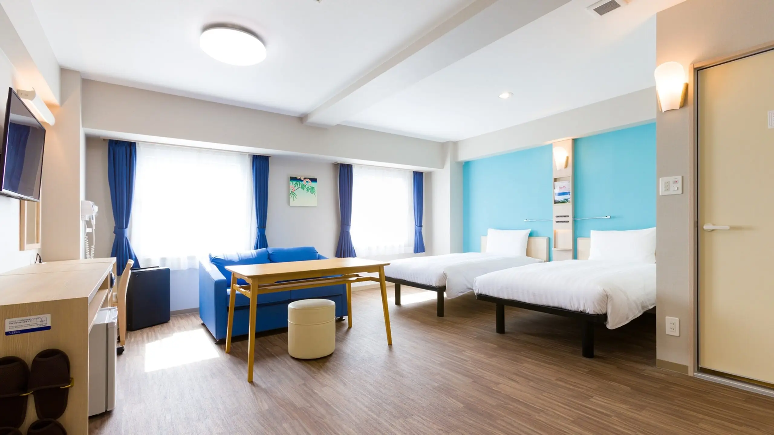 (2)ペットの立ち入り可能エリアは、客室のみとさせていただきます。 (客室内でもベッドの上とバスルームは不可)