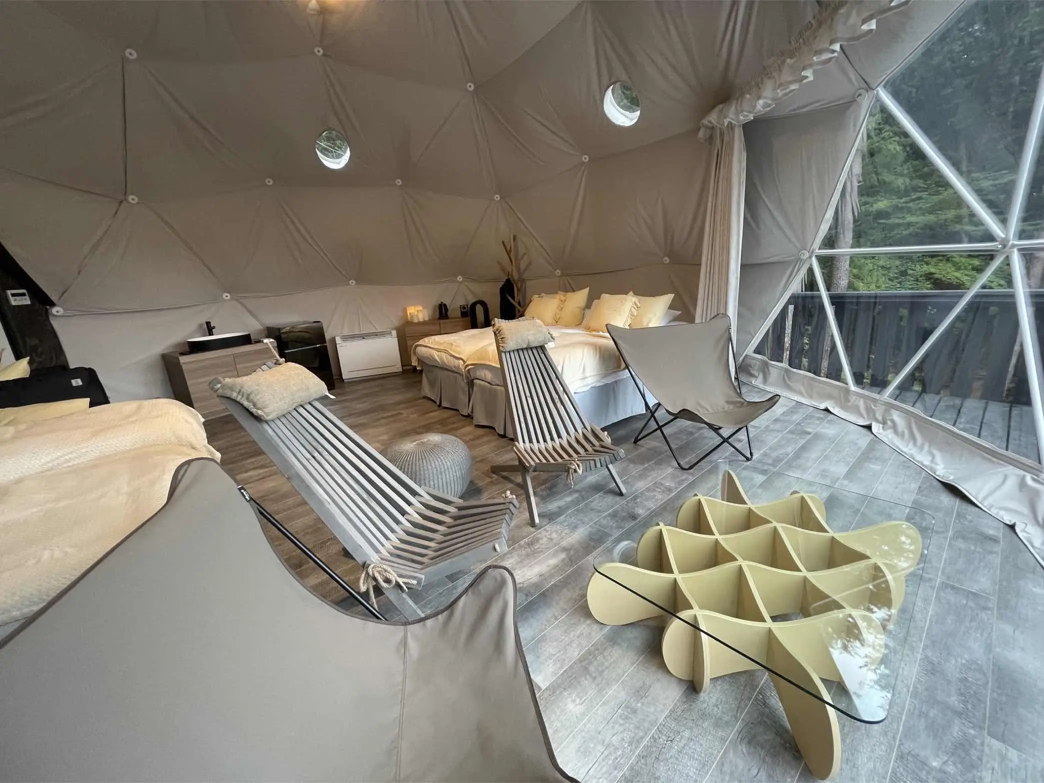小型犬2頭まで一緒に宿泊が可能です。寒さの厳しい北欧から輸入された冷暖房完備の豪華なラグジュアリードームの中で、愛犬と非日常の時間をお過ごしください。